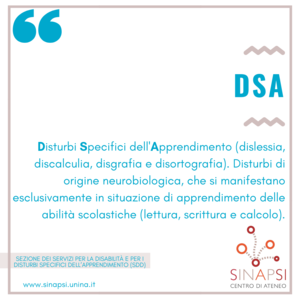 Disturbi di origine neurobiologica, che si manifestano esclusivamente in situazione di apprendimento delle abilità scolastiche (lettura, scrittura e calcolo). Anche se l’espressione del disturbo si modifica nel corso delle diverse fasi evolutive dell’individuo, esso non scompare in età adulta. È bene precisare che il disturbo non riguarda il ragionamento logico e l’intelligenza della persona, ma solo specifici dominî di abilità. Per questo i DSA possono essere considerati come una delle possibili varianti dell’architettura della mente, una atipicità del processo di apprendimento. Sulla base delle specifiche abilità che risultano alterate, il DSA può manifestarsi come:
